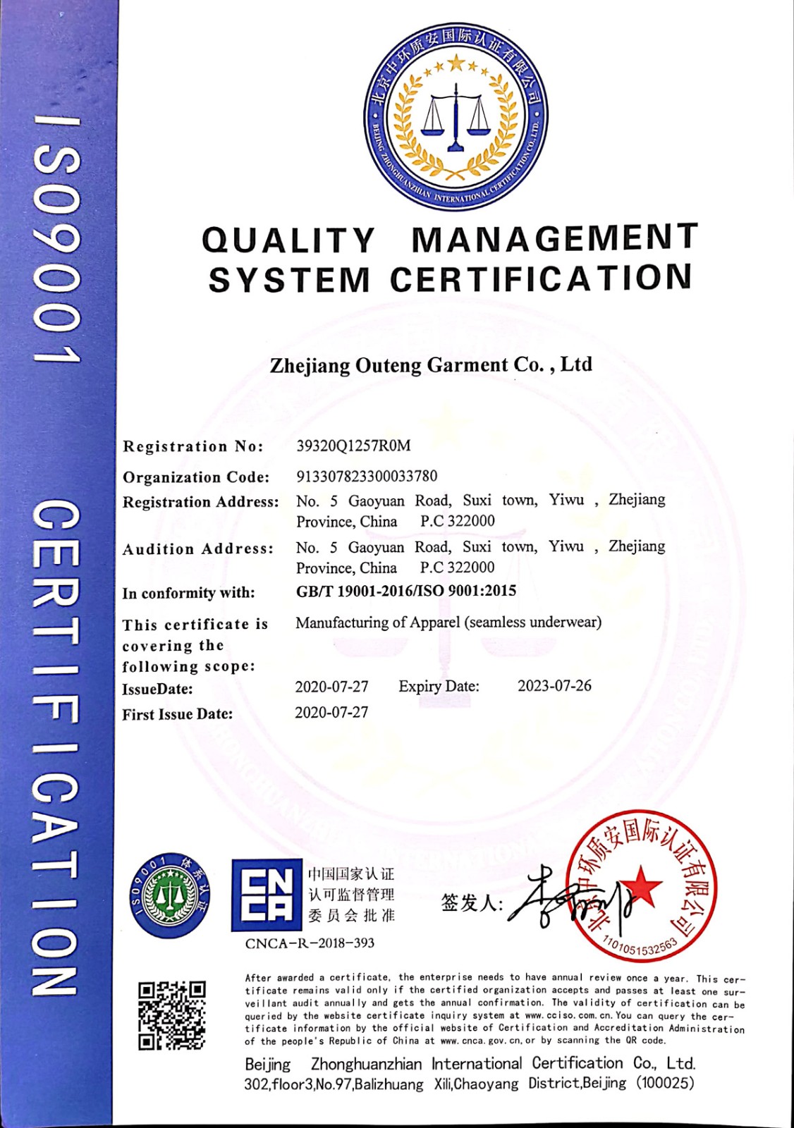 浙江歐騰服飾有限公司位于世界小商品之都-義烏。創立于2015年,是一家專業生產無縫針織運動服飾和內衣的工貿一體企業,擁有自主出口權。 工廠的占地面積約16000平方米 ,引進了大型圣東尼、高騰等多種先進的制衣設備300余臺。月產能可達90萬件。 歐騰服飾每年投入近百萬資金打樣開發新產品,有著一支高素質設計、技術員工隊伍。工廠先后通過了ISO 9001質量管理體系認證、BSCI認證、GRS認證、OEKO-TEX國際生態紡織品認證等多項專利檢測報告??商峁㎡EM&ODM服務。歐騰服飾以一套完整、科學的質量管理體系,生產的服裝從原材料紗線到成衣,質量完全能夠滿足國內、國際質量要求。獲得了客戶一致好評。工廠先后獲得省科技型企業、國家高新企業、義烏市誠信講信用單位、規上企業、信用AAA級等榮譽。